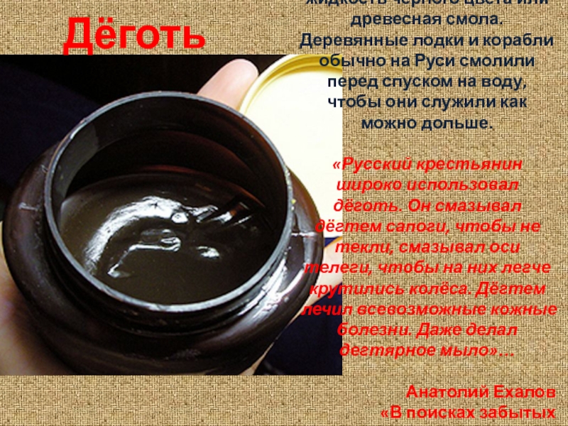 «Русский крестьянин широко использовал дёготь. Он смазывал дёгтем сапоги, чтобы не текли, смазывал оси телеги, чтобы на них легче крутились колёса. Дёгтем лечил всевозможные кожные болезни. Даже делал дегтярное мыло»…