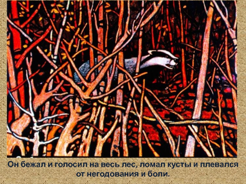 Слайд 29Он бежал и голосил на весь лес, ломал кусты и плевался
