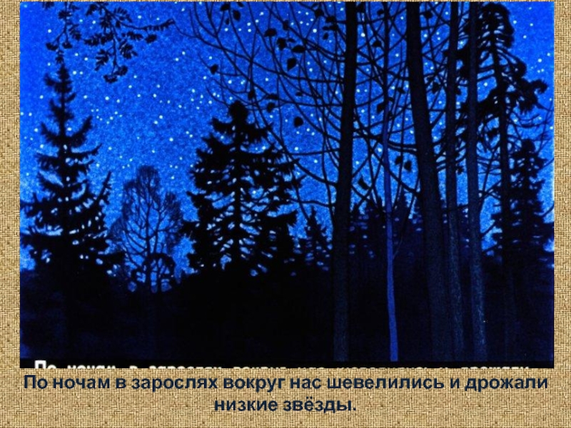Слайд 12По ночам в зарослях вокруг нас шевелились и дрожали низкие звёзды.