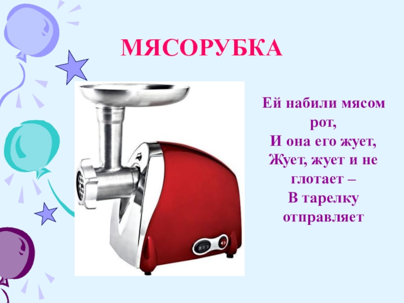 блендер  Этот помощник, как повар на кухне, Все приготовит, кнопку нажми, Все измельчит, даже не спросит,