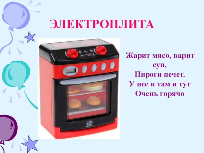 ЭЛЕКТРОПЛИТА  Жарит мясо, варит суп, Пироги печет.  У нее и там и тут  Очень горячо
