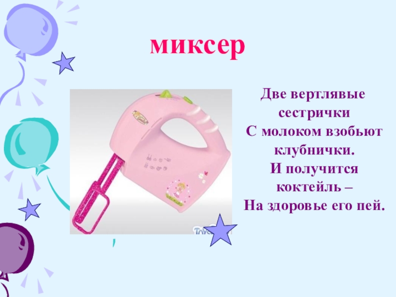 миксер Две вертлявые сестрички С молоком взобьют клубнички. И получится коктейль – На здоровье его пей.