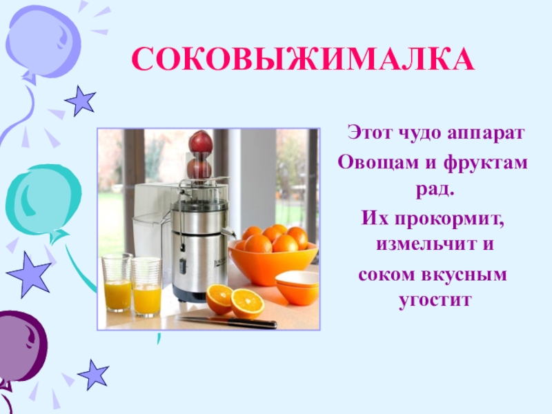 СОКОВЫЖИМАЛКА  Этот чудо аппарат  Овощам и фруктам рад.  Их прокормит, измельчит и  соком