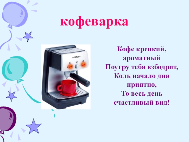 кофеваркаКофе крепкий, ароматный Поутру тебя взбодрит, Коль начало дня приятно, То весь день счастливый вид!