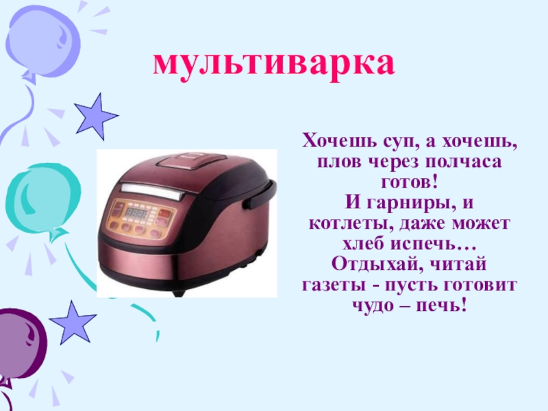 Этот помощник, как повар на кухне, Все приготовит, кнопку нажми, Все