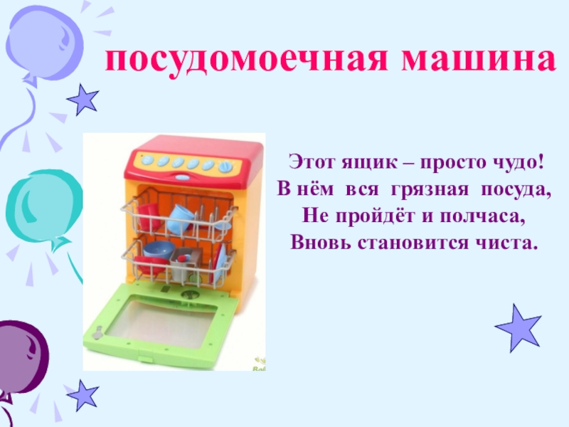 посудомоечная машина  Этот ящик – просто чудо! В нём  вся  грязная  посуда, Не пройдёт и полчаса,