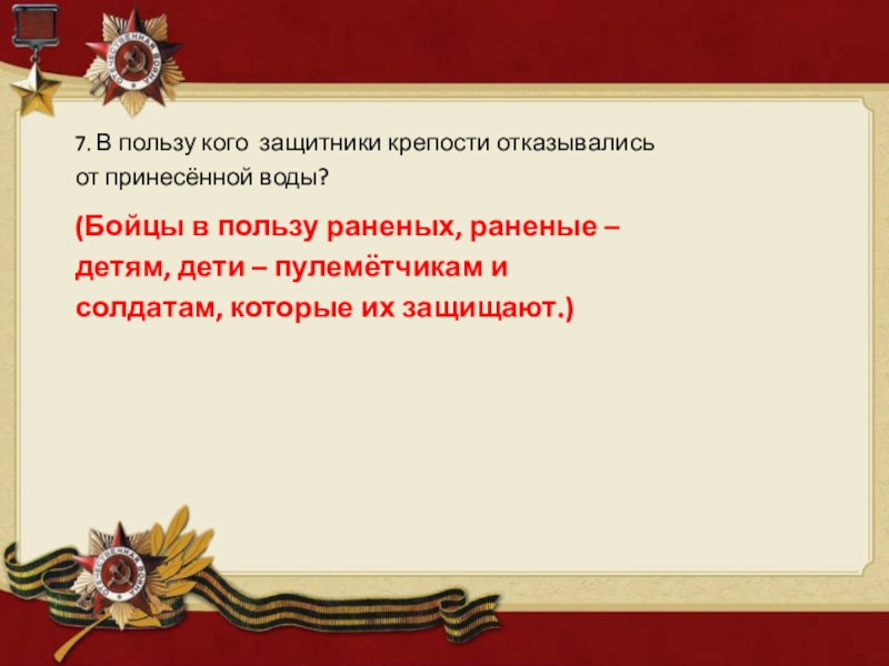 Слайд 67. В пользу кого защитники крепости отказывались от принесённой воды?