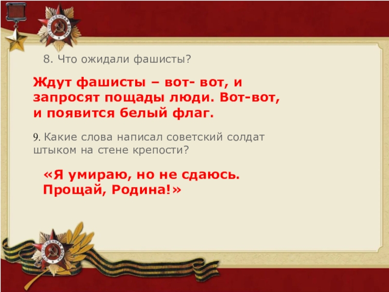 9. Какие слова написал советский солдат штыком на стене крепости?