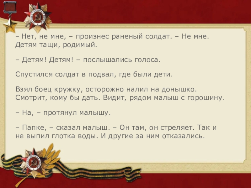Слайд 8– Нет, не мне, – произнес раненый солдат. – Не мне.
