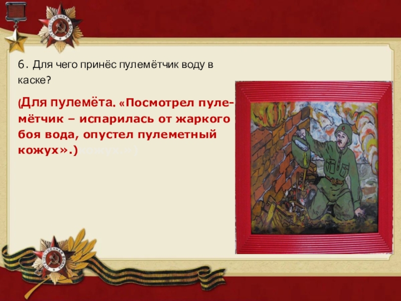 Слайд 56. Для чего принёс пулемётчик воду в каске?