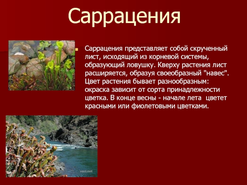 ловушку. Кверху растения лист расширяется, образуя своеобразный "навес". Цвет растения бывает разнообразным: окраска зависит от сорта принадлежности цветка. В конце весны - начале лета цветет красными или фиолетовыми цветками.