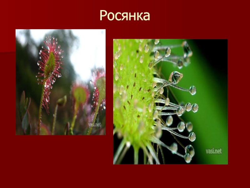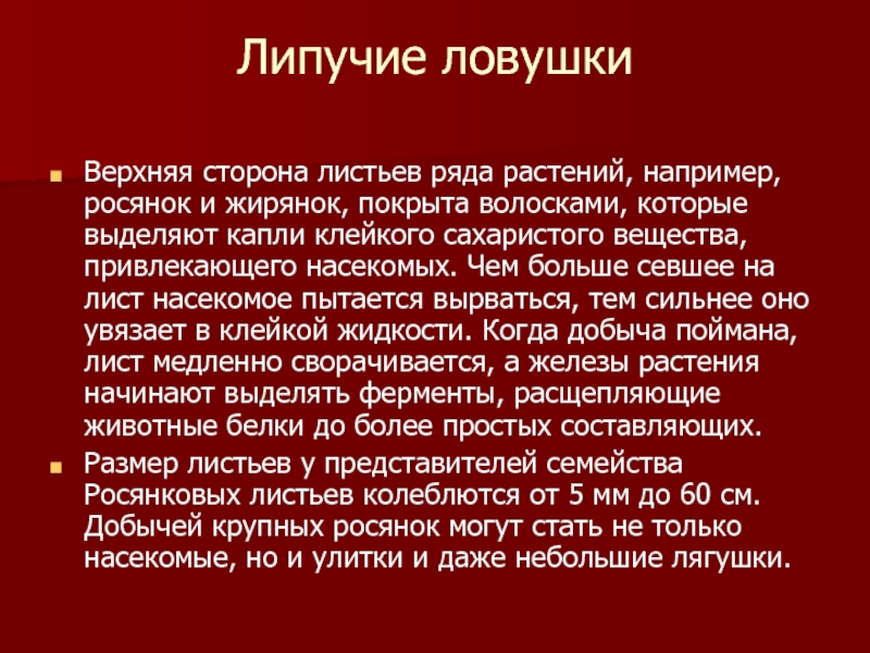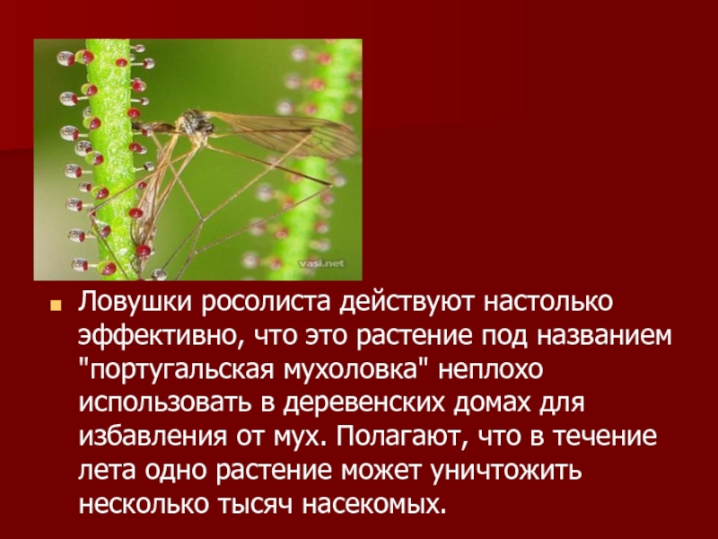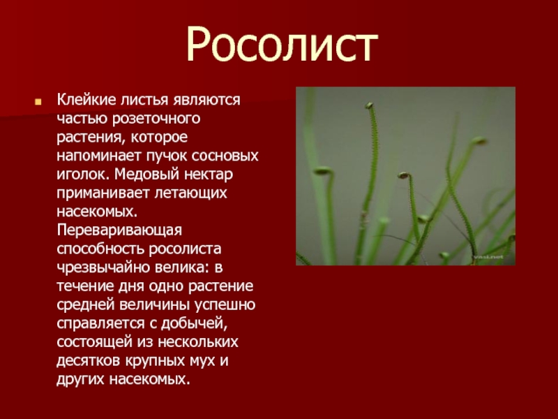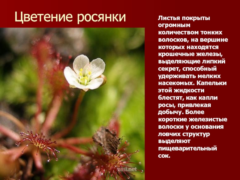 волосками, которые выделяют капли клейкого сахаристого вещества, привлекающего насекомых. Чем больше севшее на лист насекомое пытается вырваться, тем сильнее оно увязает в клейкой жидкости. Когда добыча поймана, лист медленно сворачивается, а железы растения начинают выделять ферменты, расщепляющие животные белки до более простых составляющих.