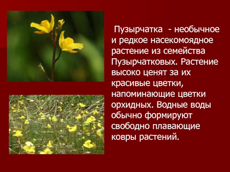 Слайд 22 Пузырчатка - необычное и редкое насекомоядное растение из семейства Пузырчатковых. Растение