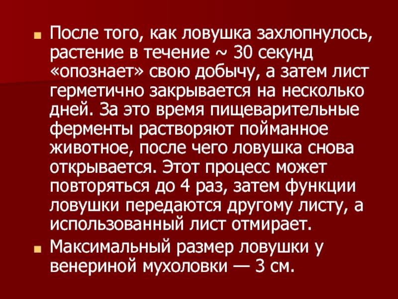 «опознает» свою добычу, а затем лист герметично закрывается на несколько дней. За это время пищеварительные ферменты растворяют пойманное животное, после чего ловушка снова открывается. Этот процесс может повторяться до 4 раз, затем функции ловушки передаются другому листу, а использованный лист отмирает.