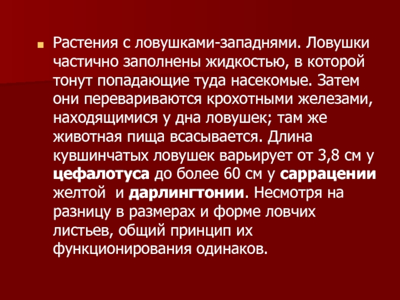 туда насекомые. Затем они перевариваются крохотными железами, находящимися у дна ловушек; там же животная пища всасывается. Длина кувшинчатых ловушек варьирует от 3,8 см у цефалотуса до более 60 см у саррацении желтой и дарлингтонии. Несмотря на разницу в размерах и форме ловчих листьев, общий принцип их функционирования одинаков.