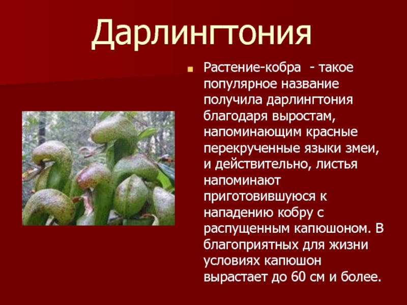 Растение-кобра - такое популярное название получила дарлингтония благодаря выростам, напоминающим красные