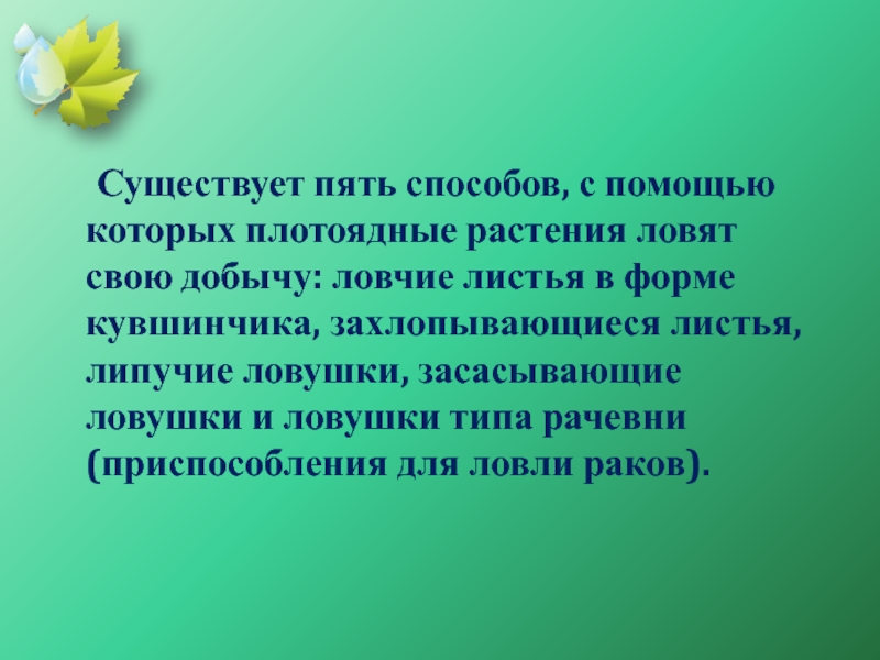 Слайд 3 Существует пять способов, с помощью которых плотоядные растения ловят свою добычу: