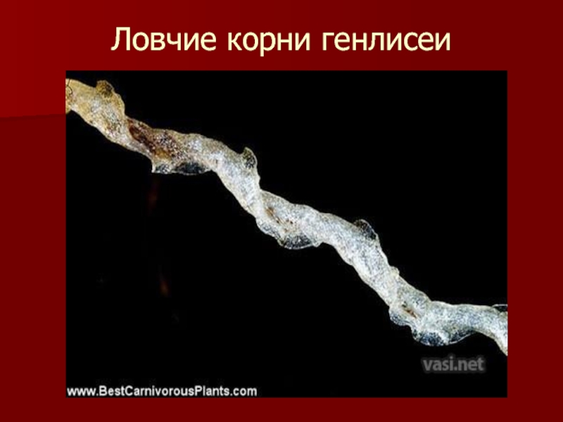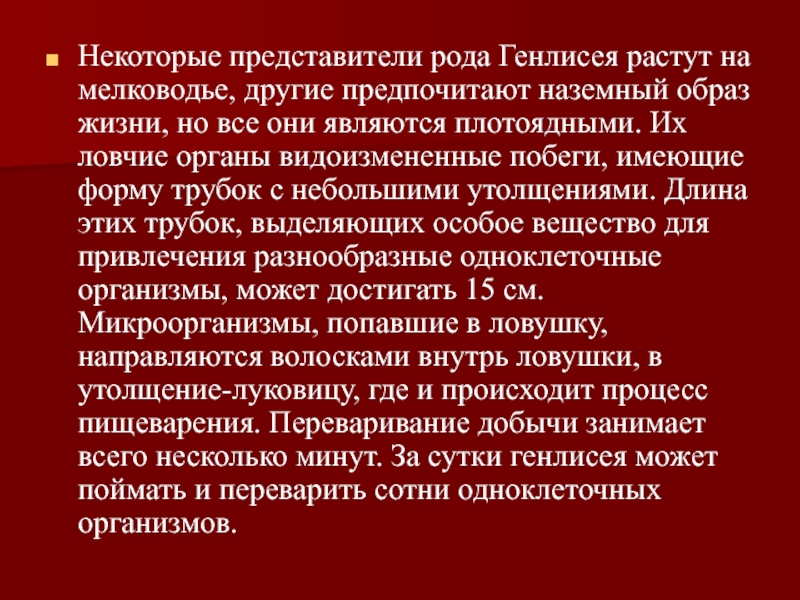жизни, но все они являются плотоядными. Их ловчие органы видоизмененные побеги, имеющие форму трубок с небольшими утолщениями. Длина этих трубок, выделяющих особое вещество для привлечения разнообразные одноклеточные организмы, может достигать 15 см. Микроорганизмы, попавшие в ловушку, направляются волосками внутрь ловушки, в утолщение-луковицу, где и происходит процесс пищеварения. Переваривание добычи занимает всего несколько минут. За сутки генлисея может поймать и переварить сотни одноклеточных организмов.