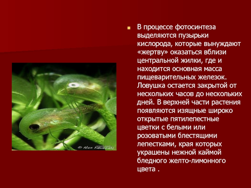 маленьких ловчих пузырьков (0,2-12 мм в диаметре), наполненными воздухом. Каждый мелкий пузырек - сложный ловчий аппарат, клапан которого открывается только внутрь. Плавающие в воде микроскопические рачки (циклопы, дафнии), мелкие водные насекомые, водоросли, случайно прикасаясь к пузырьку, способствуют быстрому открыванию клапана. Выбраться из него они уже не смогут, а желёзки, расположенные на стенках пузырьков, поглотят “тела” жертв.