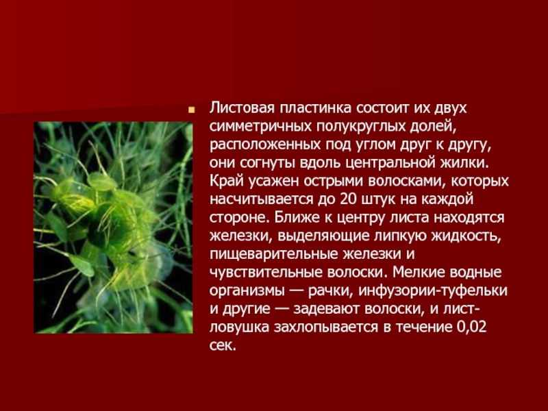друг к другу, они согнуты вдоль центральной жилки. Край усажен острыми волосками, которых насчитывается до 20 штук на каждой стороне. Ближе к центру листа находятся железки, выделяющие липкую жидкость, пищеварительные железки и чувствительные волоски. Мелкие водные организмы — рачки, инфузории-туфельки и другие — задевают волоски, и лист-ловушка захлопывается в течение 0,02 сек.