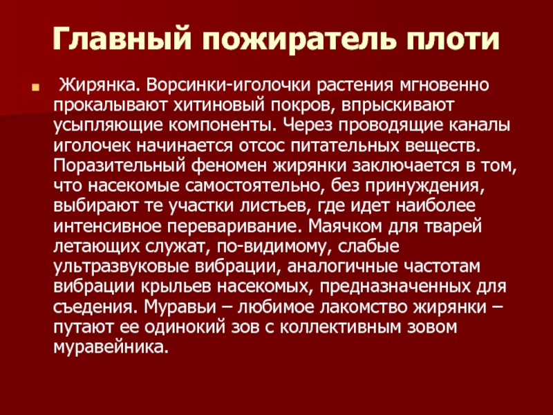 усыпляющие компоненты. Через проводящие каналы иголочек начинается отсос питательных веществ. Поразительный феномен жирянки заключается в том, что насекомые самостоятельно, без принуждения, выбирают те участки листьев, где идет наиболее интенсивное переваривание. Маячком для тварей летающих служат, по-видимому, слабые ультразвуковые вибрации, аналогичные частотам вибрации крыльев насекомых, предназначенных для съедения. Муравьи – любимое лакомство жирянки – путают ее одинокий зов с коллективным зовом муравейника.