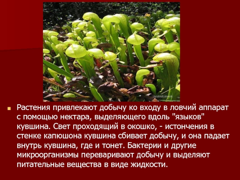 выделяющего вдоль "языков" кувшина. Свет проходящий в окошко, - истончения в стенке капюшона кувшина сбивает добычу, и она падает внутрь кувшина, где и тонет. Бактерии и другие микроорганизмы переваривают добычу и выделяют питательные вещества в виде жидкости.