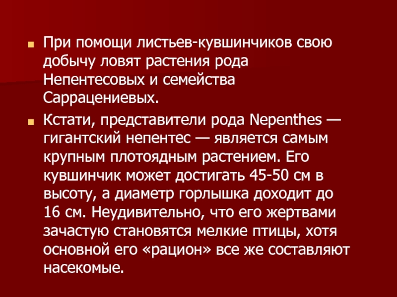 Кстати, представители рода Nepenthes — гигантский непентес — является самым крупным плотоядным растением. Его кувшинчик может достигать 45-50 см в высоту, а диаметр горлышка доходит до 16 см. Неудивительно, что его жертвами зачастую становятся мелкие птицы, хотя основной его «рацион» все же составляют насекомые.