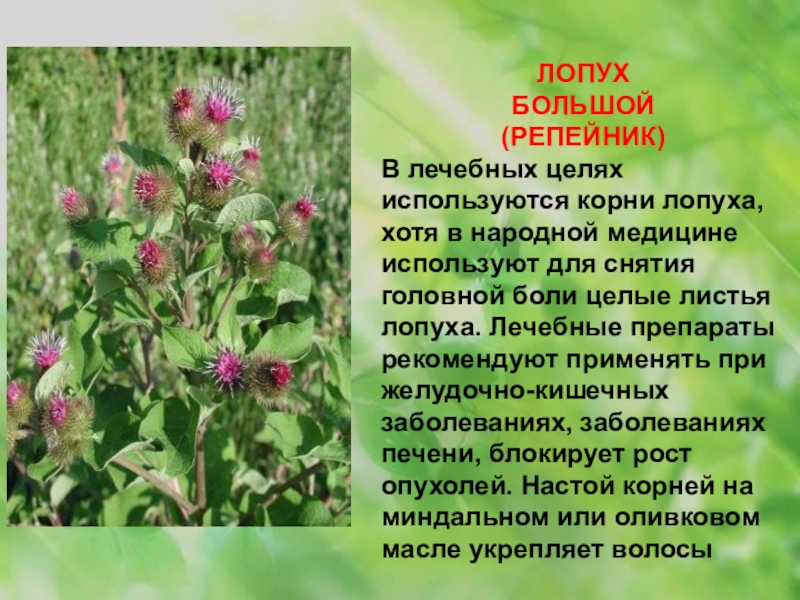 для снятия головной боли целые листья лопуха. Лечебные препараты рекомендуют применять при желудочно-кишечных заболеваниях, заболеваниях печени, блокирует рост опухолей. Настой корней на миндальном или оливковом масле укрепляет волосы