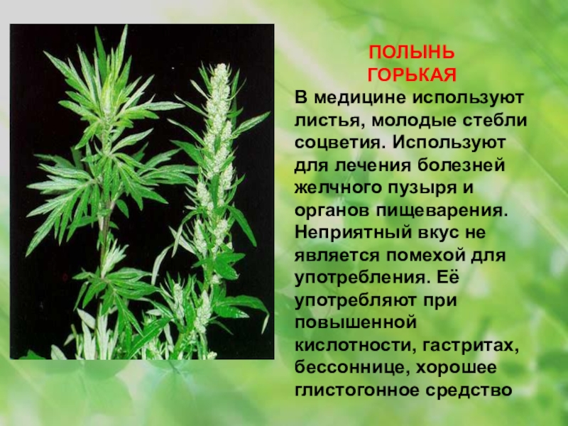 болезней желчного пузыря и органов пищеварения. Неприятный вкус не является помехой для употребления. Её употребляют при повышенной кислотности, гастритах, бессоннице, хорошее глистогонное средство