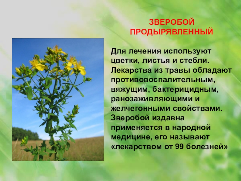 противовоспалительным, вяжущим, бактерицидным, ранозаживляющими и желчегонными свойствами. Зверобой издавна применяется в народной медицине, его называют «лекарством от 99 болезней»