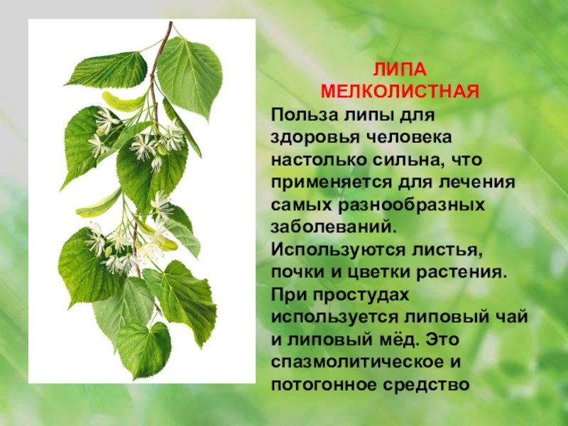 самых разнообразных заболеваний. Используются листья, почки и цветки растения. При простудах используется липовый чай и липовый мёд. Это спазмолитическое и потогонное средство