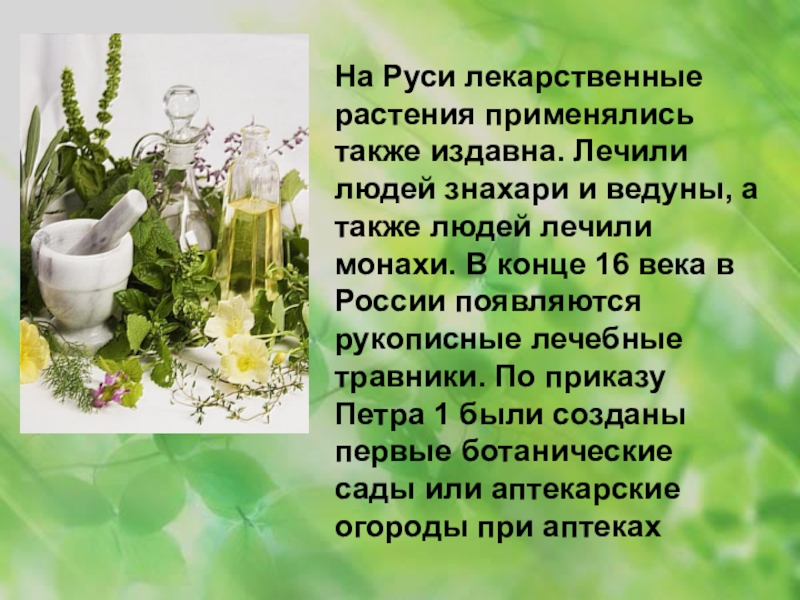 На Руси лекарственные растения применялись также издавна. Лечили людей знахари и