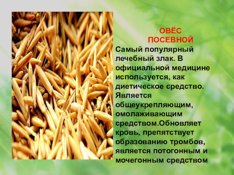 Самый популярный лечебный злак. В официальной медицине используется, как диетическое средство.