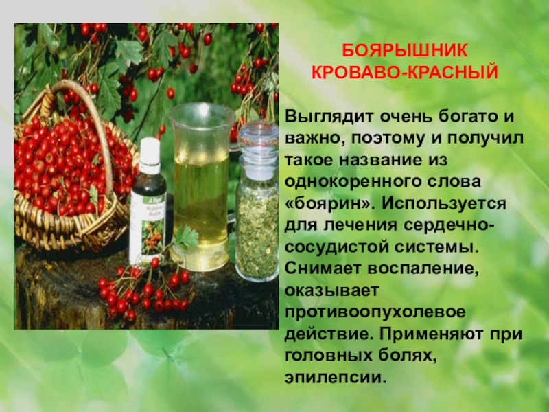 «боярин». Используется для лечения сердечно-сосудистой системы. Снимает воспаление, оказывает противоопухолевое действие. Применяют при головных болях, эпилепсии.