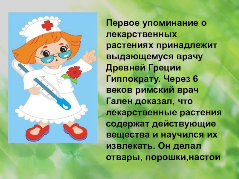 Первое упоминание о лекарственных растениях принадлежит выдающемуся врачу Древней Греции Гиппократу.