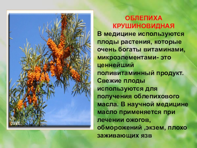 ценнейший поливитаминный продукт. Свежие плоды используются для получения облепихового масла. В научной медицине масло применяется при лечении ожогов, обморожений ,экзем, плохо заживающих язв