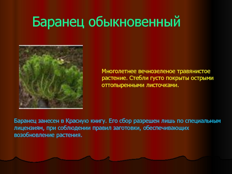 Баранец занесен в Красную книгу. Его сбор разрешен лишь по специальным лицензиям, при соблюдении правил заготовки, обеспечивающих возобновление растения.