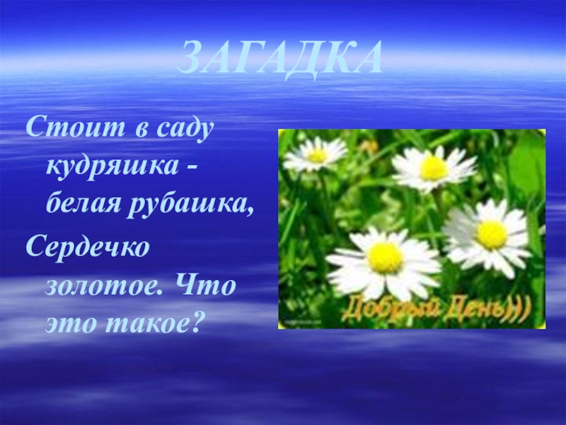 ЗАГАДКАСтоит в саду кудряшка - белая рубашка, Сердечко золотое. Что это такое?