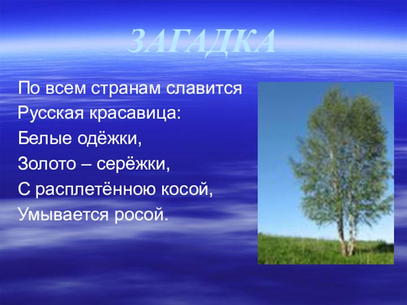 ЗАГАДКАПо всем странам славитсяРусская красавица:Белые одёжки,Золото – серёжки,С расплетённою косой,Умывается росой.