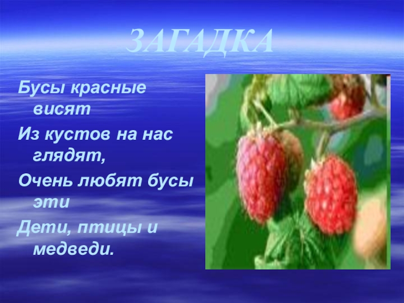 ЗАГАДКАБусы красные висятИз кустов на нас глядят,Очень любят бусы этиДети, птицы и медведи.