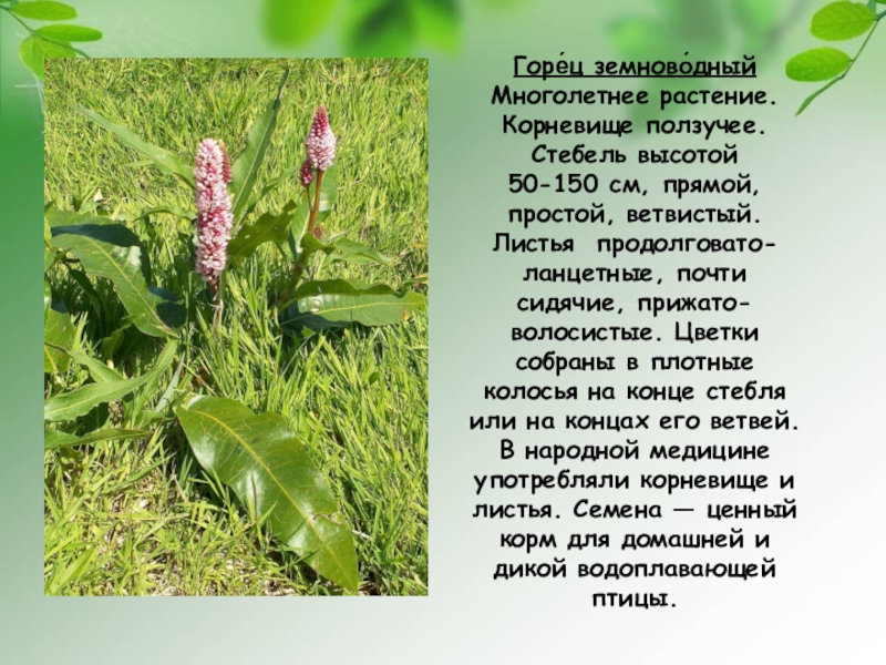 Горе́ц земново́дныйМноголетнее растение. Корневище ползучее. Стебель высотой 50-150 см, прямой, простой, ветвистый. Листья продолговато-ланцетные, почти сидячие, прижато-волосистые. Цветки