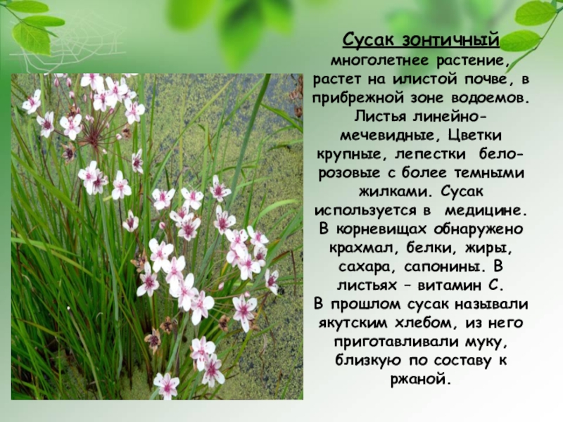 Слайд 6Сусак зонтичный многолетнее растение, растет на илистой почве, в прибрежной зоне