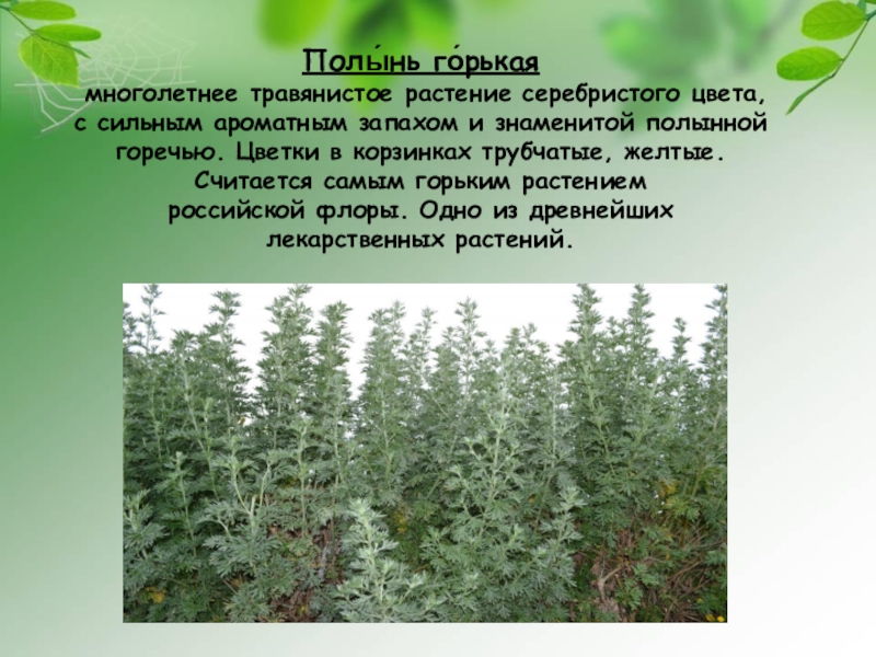 Полы́нь го́рькая многолетнее травянистое растение серебристого цвета, с сильным ароматным запахом и знаменитой полынной горечью. Цветки в корзинках трубчатые, желтые.Считается