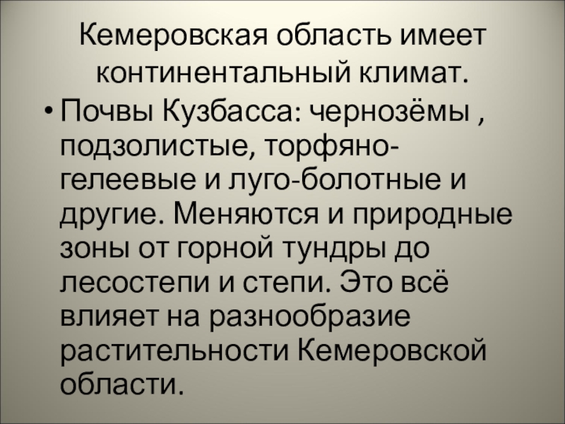 Почвы Кузбасса: чернозёмы , подзолистые, торфяно-гелеевые и