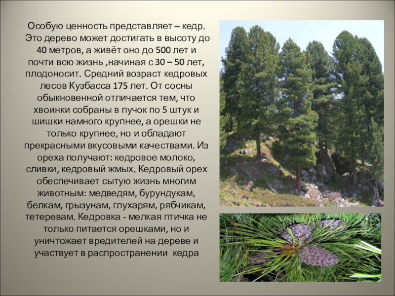 до 40 метров, а живёт оно до 500 лет и почти всю жизнь ,начиная с 30 – 50 лет, плодоносит. Средний возраст кедровых лесов Кузбасса 175 лет. От сосны обыкновенной отличается тем, что хвоинки собраны в пучок по 5 штук и шишки намного крупнее, а орешки не только крупнее, но и обладают прекрасными вкусовыми качествами. Из ореха получают: кедровое молоко, сливки, кедровый жмых. Кедровый орех обеспечивает сытую жизнь многим животным: медведям, бурундукам, белкам, грызунам, глухарям, рябчикам, тетеревам. Кедровка - мелкая птичка не только питается орешками, но и уничтожает вредителей на дереве и участвует в распространении кедра