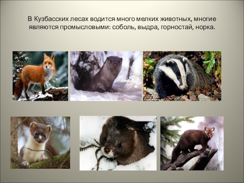Слайд 17В Кузбасских лесах водится много мелких животных, многие являются промысловыми: соболь,