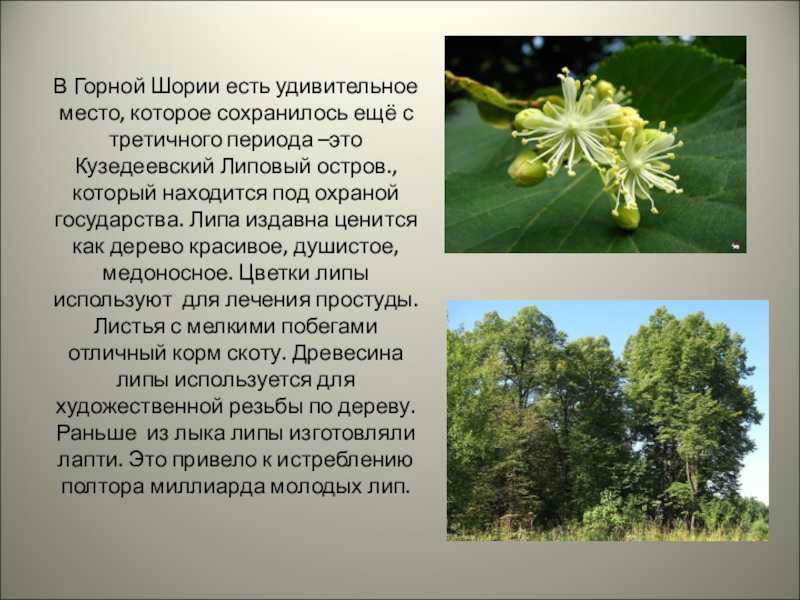 периода –это Кузедеевский Липовый остров., который находится под охраной государства. Липа издавна ценится как дерево красивое, душистое, медоносное. Цветки липы используют для лечения простуды. Листья с мелкими побегами отличный корм скоту. Древесина липы используется для художественной резьбы по дереву. Раньше из лыка липы изготовляли лапти. Это привело к истреблению полтора миллиарда молодых лип.