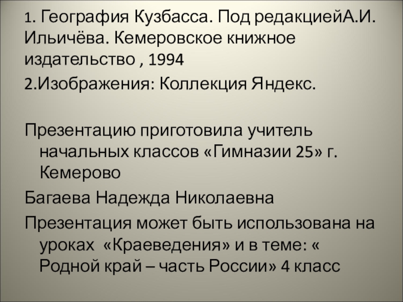 Слайд 211. География Кузбасса. Под редакциейА.И. Ильичёва. Кемеровское книжное издательство , 1994