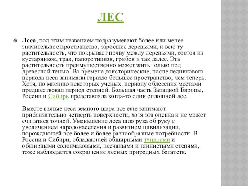 деревьями, и всю ту растительность, что покрывает почву между деревьями, состоя из кустарников, трав, папоротников, грибов и так далее. Эта растительность преимущественно может жить только под древесной тенью. Во времена доисторические, после ледникового периода леса занимали гораздо большее пространство, чем теперь. Хотя, по мнению некоторых ученых, периоду облесения местами предшествовал период степной. Большая часть Западной Европы, России и Сибирь представляла когда-то один сплошной лес.