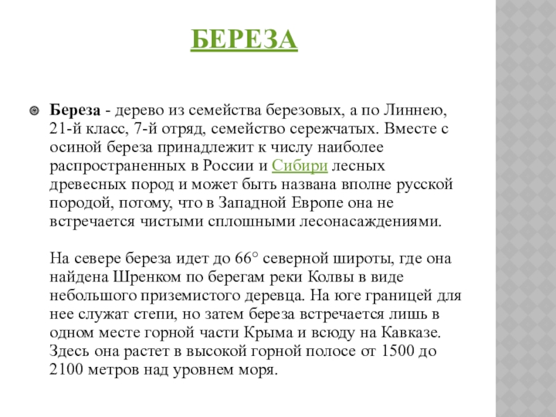 Береза - дерево из семейства березовых, а по Линнею, 21-й класс, 7-й